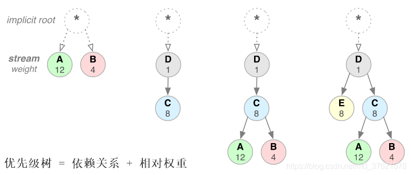 既然同属于一个网页的不同资源之间存在一定的依赖关系,我们可以从依赖关系入手来描述不同资源的相对优先级。HTTP/2 正是采用依赖关系树和树里的相对权重实现网页内不同资源的相对优先级管理的: