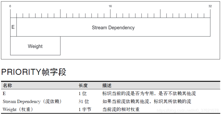 HEADERS帧结构中的E、Stream Dependency、Weight 三个可选字段都依赖于PRIORITY帧设置,PRIORITY 帧是为了标识流的优先级,下文介绍流时再展开。