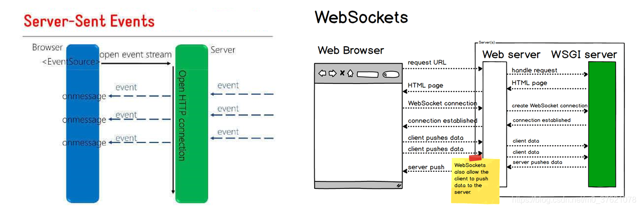 | 只能客户端发起请求,服务器响应请求,服务器端的数据更新不能及时反馈给客户端 | 支持服务器端向客户端推送资源,服务器端的数据更新可以及时反馈给客户端,也可以通过预判客户端需求提前向客户端推送相应资源,提高客户端的访问响应效率 |