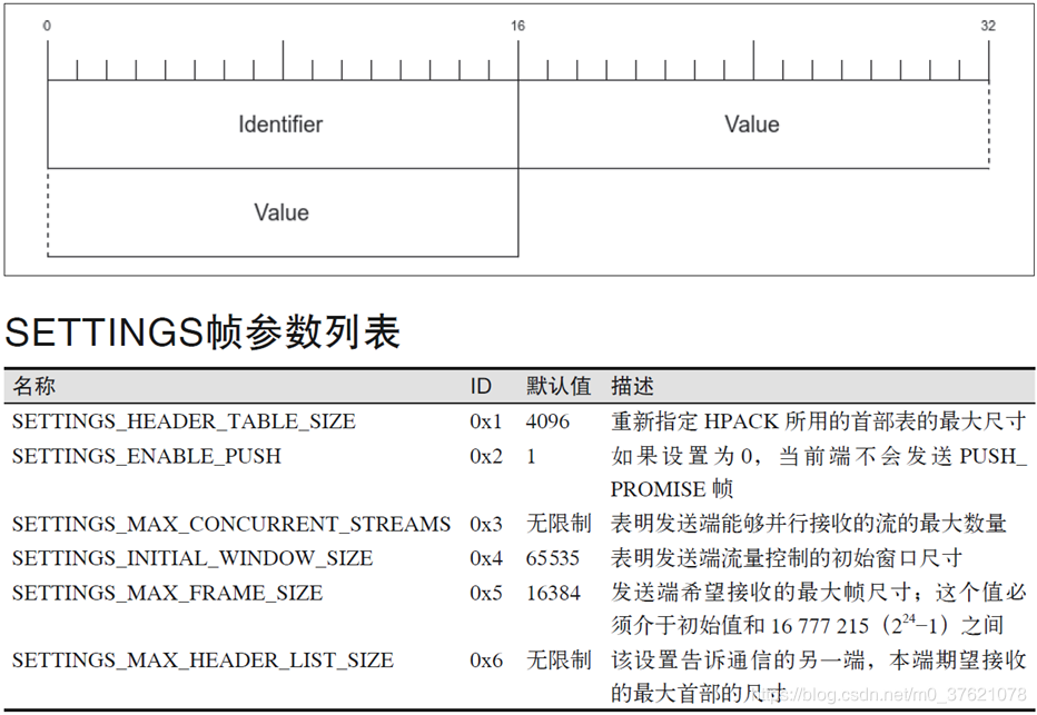在一个TCP连接上支持的最大并发流数量由SETTINGS帧的SETTINGS_MAX_CONCURRENT_STREAMS 参数控制,前面也介绍过HTTP/2 帧负载的长度如果超过 214 字节就需要在SETTINGS帧中设置,这里简单介绍下SETTINGS帧结构及参数列表如下: