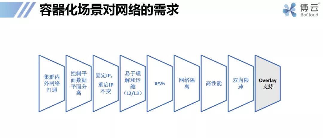 从2015年开始,博云开始基于Kubernetes和容器帮助客户交付应用管理平台。在开始阶段,博云选择了业界使用度非常广泛且成熟稳定的calico作为默认的网络方案并在calico方面积累了大量生产实践经验。随着容器云平台的落地越来越多,关于容器云平台网络部分的建设要求也越来越高,我们和多家客户进行了深入沟通,虽然需求有所差异,但总结下来主要的诉求包括: