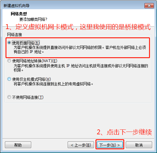 桥接:虚拟机的IP地址需要和笔记本在相同的网段,更换网络环境后需要不断的更正,对虚拟机的数量有限制;