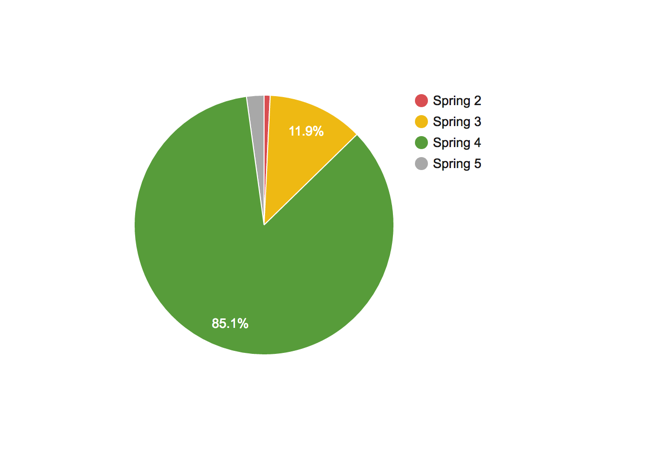 Spring社区充分采用了Spring4 - 超过85%的份额,Spring Boot也高达70%,这意味着大多数Spring开发人员也在积极使用新的框架。