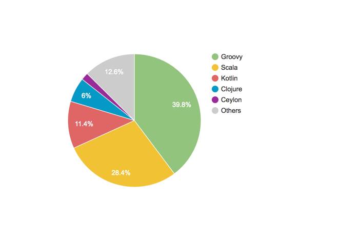 Groovy显然超强一步,达到了40%的份额,Scala紧随其后,超过28.5%份额,Kotlin位居第3,达到了惊人的11.5%的份额。
