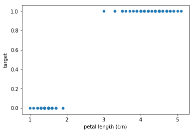 data[['petal length (cm)', 'target']].head(100).plot.scatter(x='petal length (cm)', y='target')