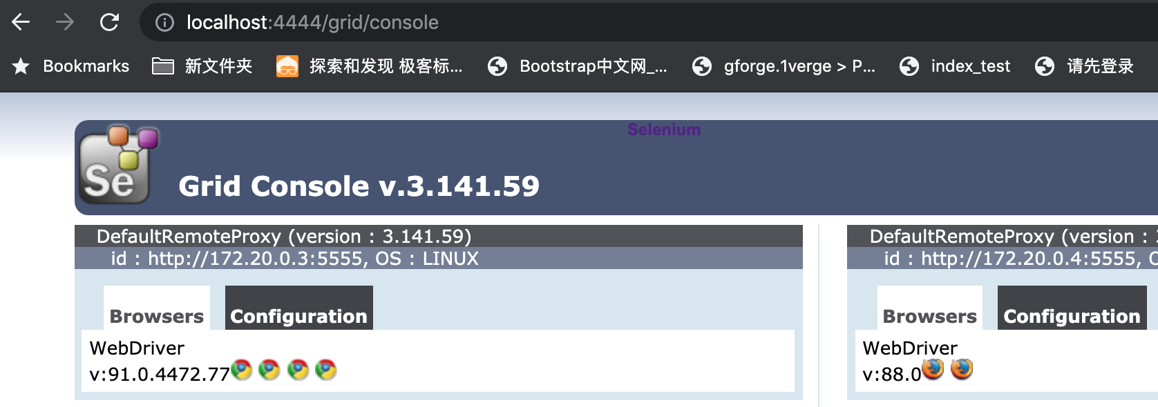 随后访问浏览器 http://localhost:4444/grid/console ,这里请求的ip是宿主机本地的,但其实是通过端口映射访问docker容器内的Selenium Grid调度中心:
