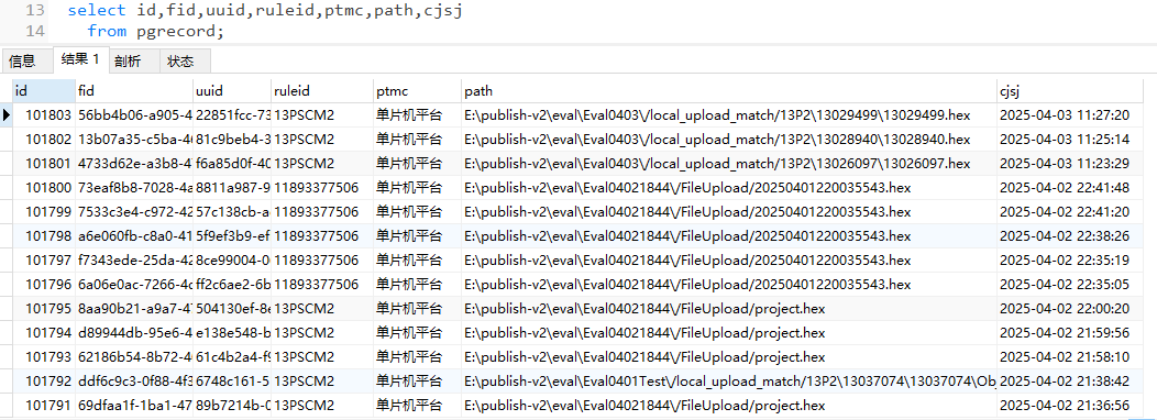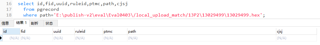 看到了没path列的数据有“\”,正常情况下path列应该存储相对路径“/publish-v2/eval/Eval0403/local_upload_match/13P2/13029499/13029499.hex”,结果现在存储的是“E:\publish-v2\eval\Eval0403\/local_upload_match/13P2\13029499\13029499.hex”,不仅有/还有\,而且存储的是绝对路径,整个一无语(