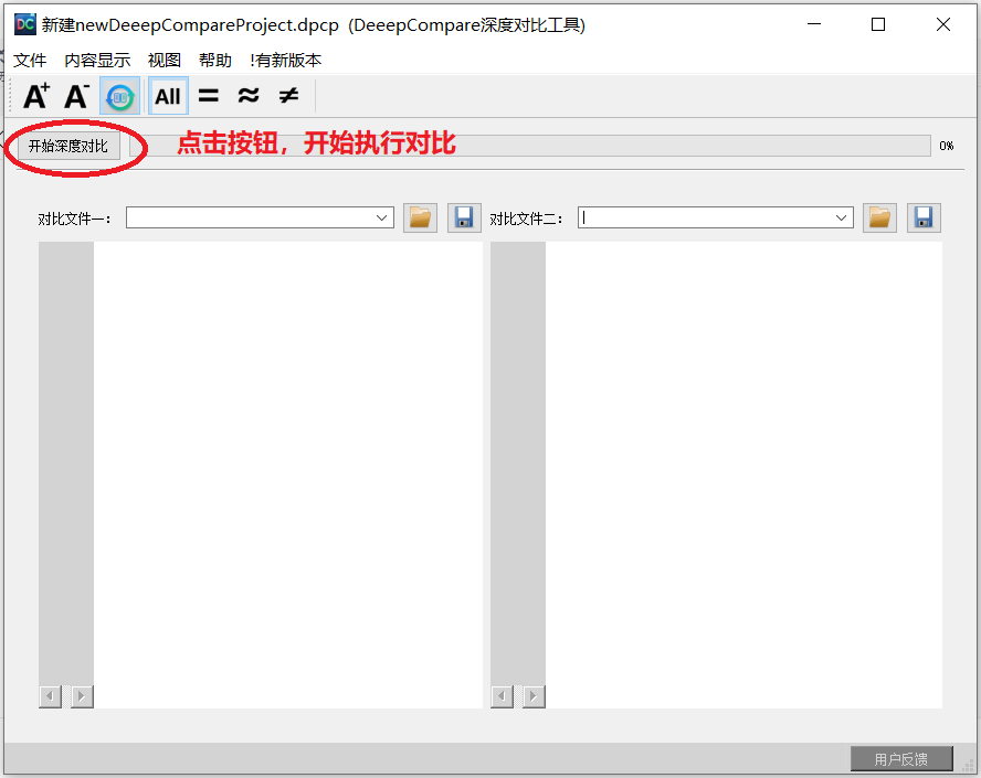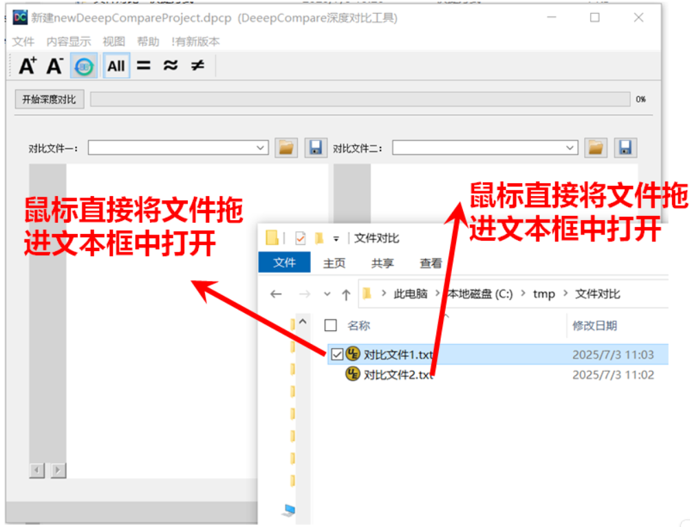 方法1:点击左右窗口的“打开”按钮,分别选择路径打开需要对比的两个文本文件;