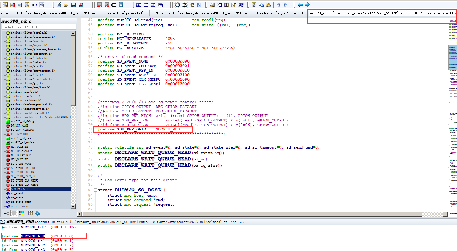 1.根据硬件原理图,找到对应控制sd卡电源的gpio引脚,并在sd卡驱动文件中定义操作改该引脚的宏