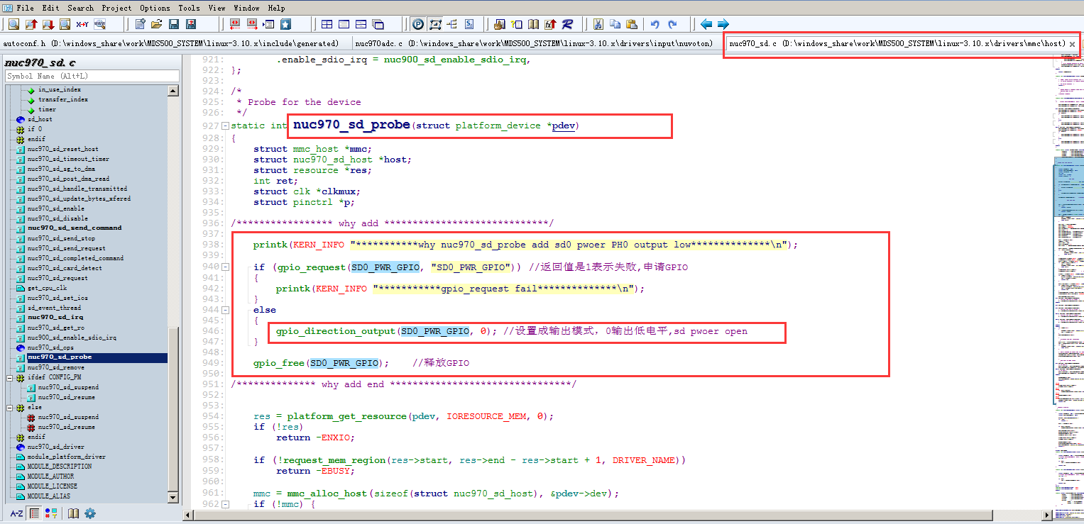 NUC972当检测到sd卡时,在sd卡驱动中操作gpio开启sd卡的电源,解决sd卡因低电压有时识别不正常的问题