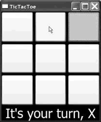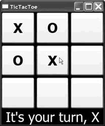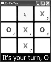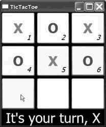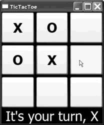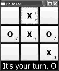DataTrigger元素使用在Style.Trigger元素中,正如属性触发器一样,这里可以有多于一个是活动的在任何时刻。一个属性触发器在显示内容的可视化元素的属性上操作,而数据触发器在其自身进行操作。这我们这种情形下,每一个单元格的内容都是一个PlayerMove对象。在我们的两个数据触发器中,我们绑定了PlayerName属性。如果值为X,我们就设置前景色为红色;如果为O,就设置为绿色。
