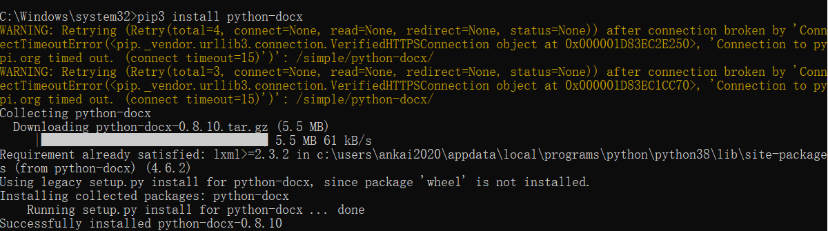 搜教程,很多文章都推荐使用:pip install python_docx‑0.8.10‑py2.py3‑none‑any.whl
