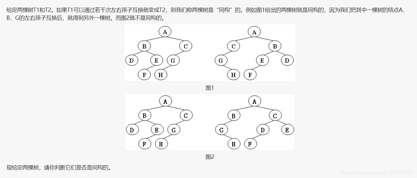 给定两棵树T1和T2.如果T1可以通过若干次左右孩子互换就变成T2,则我们称两棵树是"同构"的.例如图1给出的两棵树就是同构的,因为我们把其中一棵树的结点A.B.G的左右孩子互换后 ...