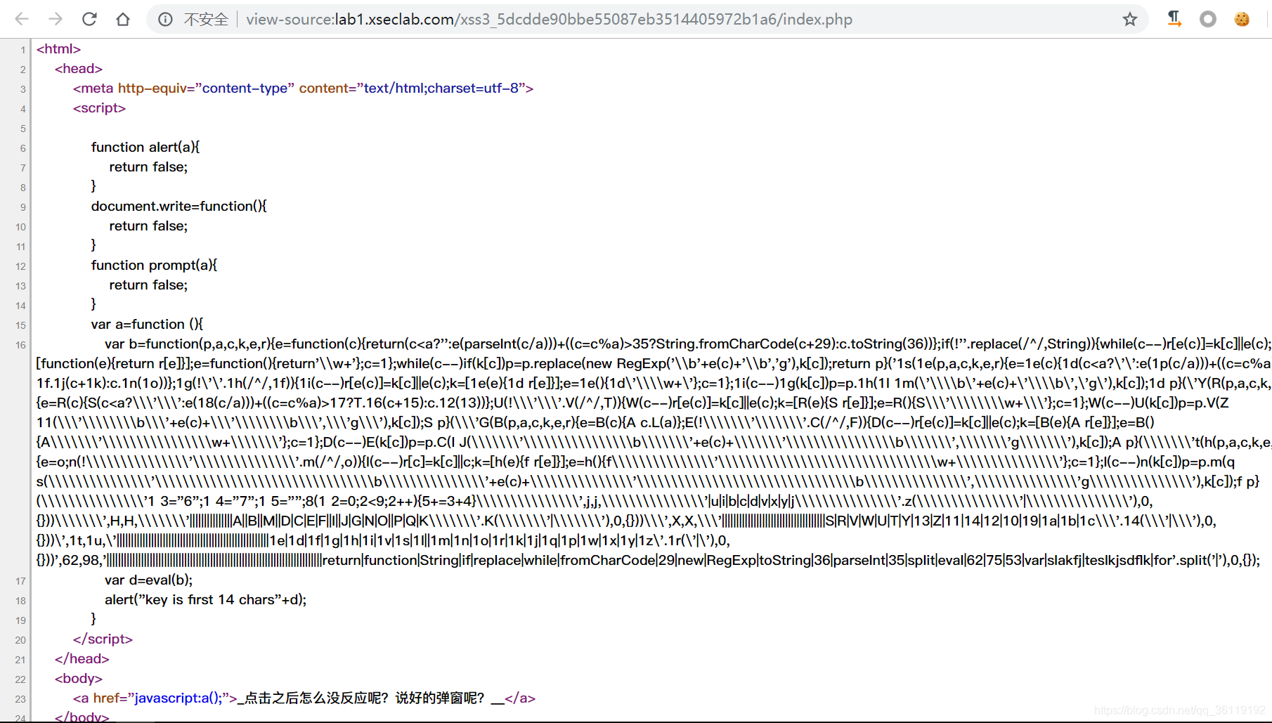 右键查看源代码发现变量a其实是一个匿名函数,而且js里面也禁用了一些常用的弹出对话框的函数