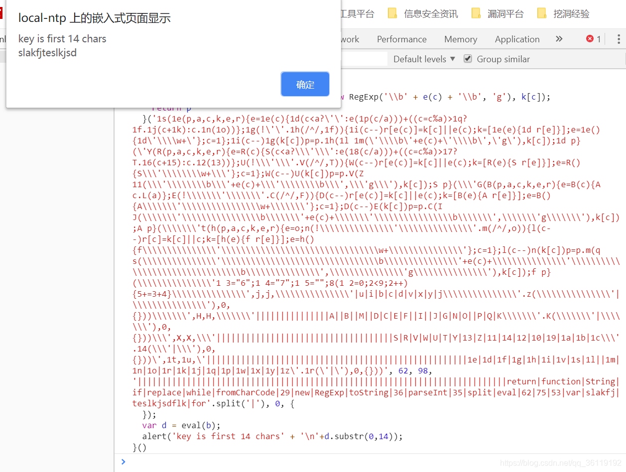 将这段代码复制到新建页面的console控制台,回车即可弹出,得到key: slakfjteslkjsd