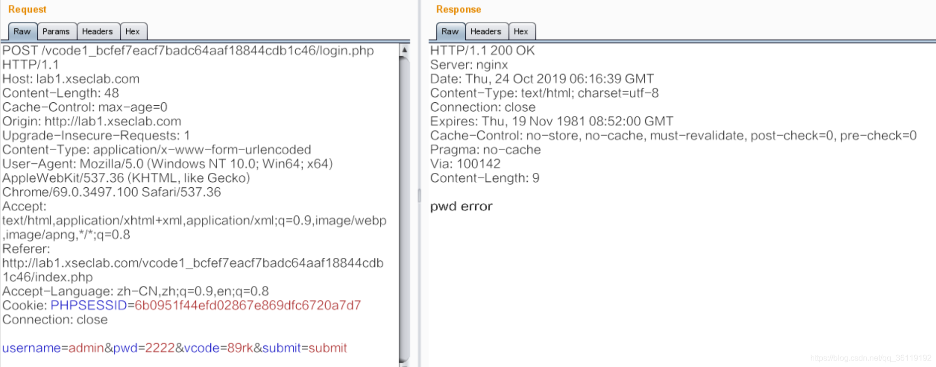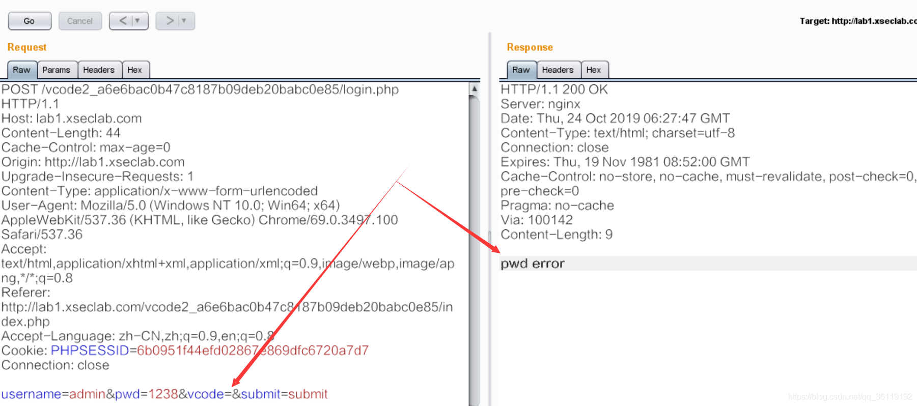访问通关地址,输入任意的4位数字进行登录,返回pwd error。重放,返回的还是 pwd error。由此可知验证码失效