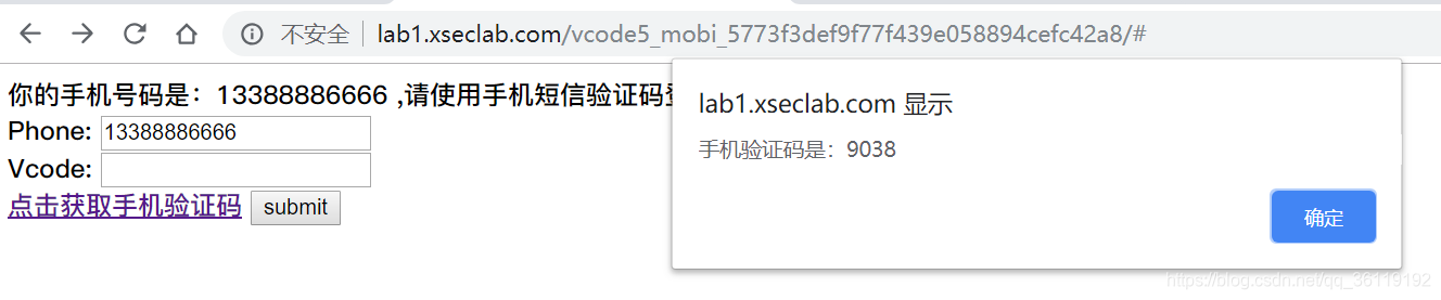 访问通关地址,点击获取验证码弹出手机验证码是9038