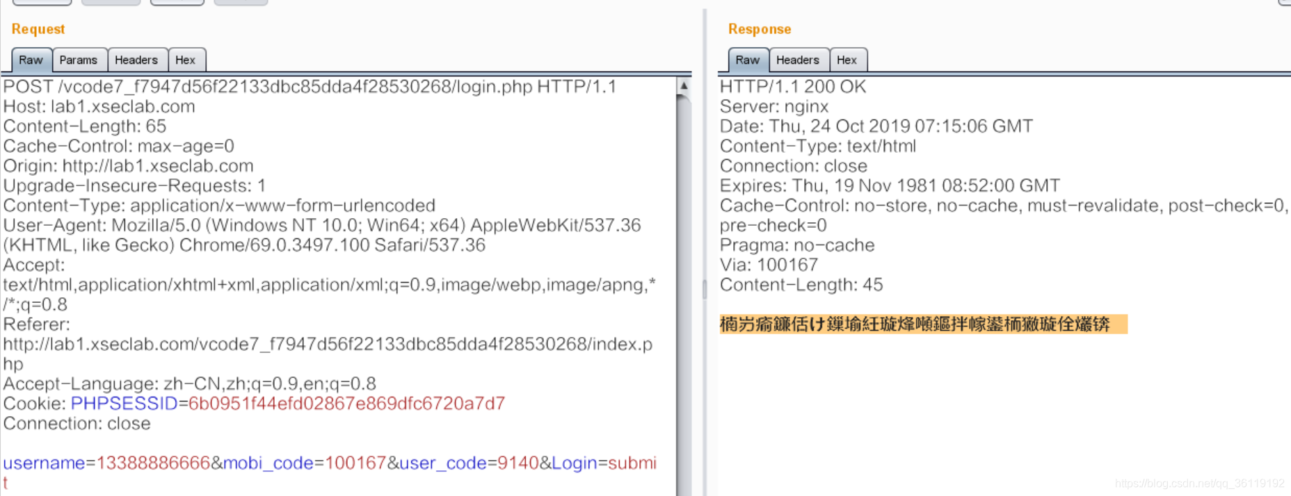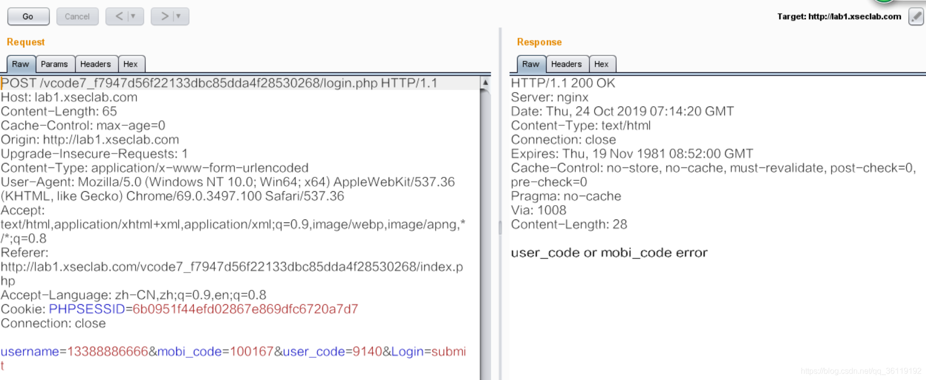 于是输入任意的手机验证码,输入正确的图形验证码登录,用bp抓包,提示user_code or mobi_code error