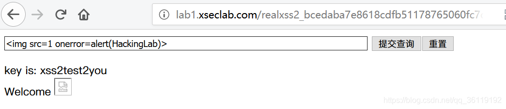 这道题过滤了 <script></script> 标签,所以我们可以输入其他标签。输入 <img src=1 οnerrοr=alert(HackingLab)>