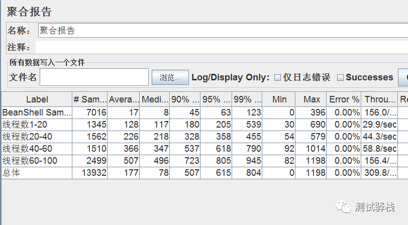 假设现在一共会加载100个线程,我期望聚合报告中分别展示1-20,20-40,40-60,60-80的四个阶段的线程并发性能数据,而不是一共总体的统计数据。