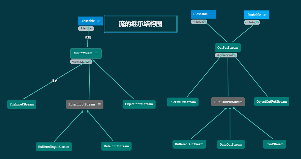 输入流是从文件读取数据,是一个拉取数据的过程; 输出流是将数据写入到文件中,是一个推送数据的过程。