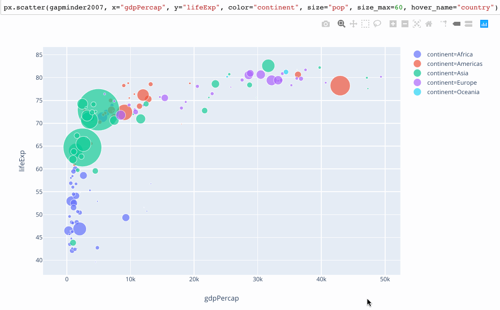 如果你好奇哪个国家对应哪个点? 可以添加一个 hover_name ,你可以轻松识别任何一点:只需将鼠标放在你感兴趣的点上即可! 事实上,即使没有 hover_name ,整个图表也是互动的: