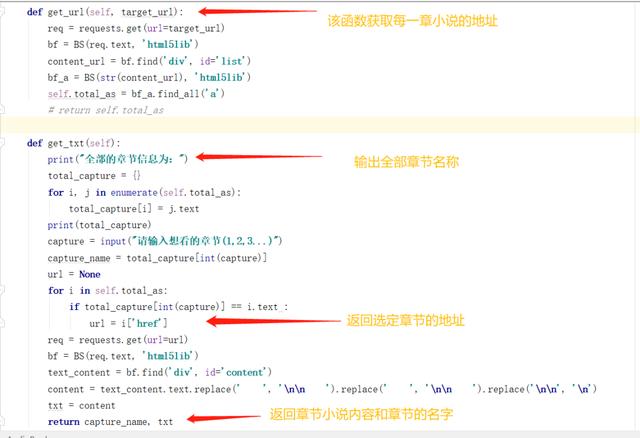 接下来是对小说相应章节的提取,get_url函数返回所有章节的地址链接信息。get_txt函数。首先输出所有章节的名称,然后大家选择自己想要阅读的章节,程序接下来便会爬取该章节的内容,并返回选择的章节名称和章节的内容。返回的小说内容会被写入到本地的特定文件夹当中,也就完成了我们流程的前半部分。部分程序如下图所示: