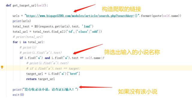 由于网页会返回所有名字包含我们输入名称的小说,所以我们要进行筛选,筛选出完全符合我们输入名称的小说,然后返回该小说的地址。如果找不到该小说,则程序退出。