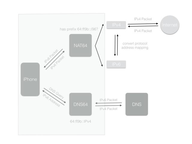 这次IPv6的推进,是一次对IP layer的复习机会。大部分人包括我自己对HTTP,TCP相对熟悉一些,IP层由于项目当中接触少,更多还是停留在大学学习的基础概念上。这次趁着Apple的这股东风,好好翻了几篇RFC文档,画了一张下面的图,也同时把公司App的socket迁移方案理顺了。这当中最重要的两个概念是DNS64和NAT64。