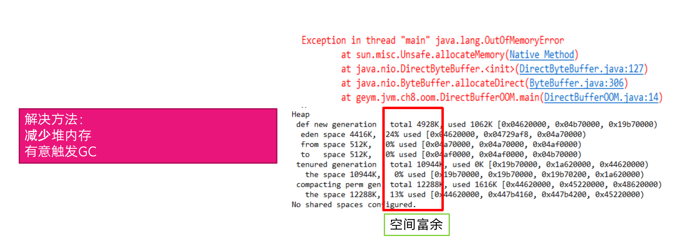 解析:同上面的栈空间解析一样,这三者加起来不能超过系统可分配的总空间,所以减小堆内存,能够解决直接内存堆栈溢出的问题。直接内存分配不会引起GC,只有堆和永久区会导致GC的发生,虽然直接内存是能够被jvm回收的,但是不能够自动触发GC。