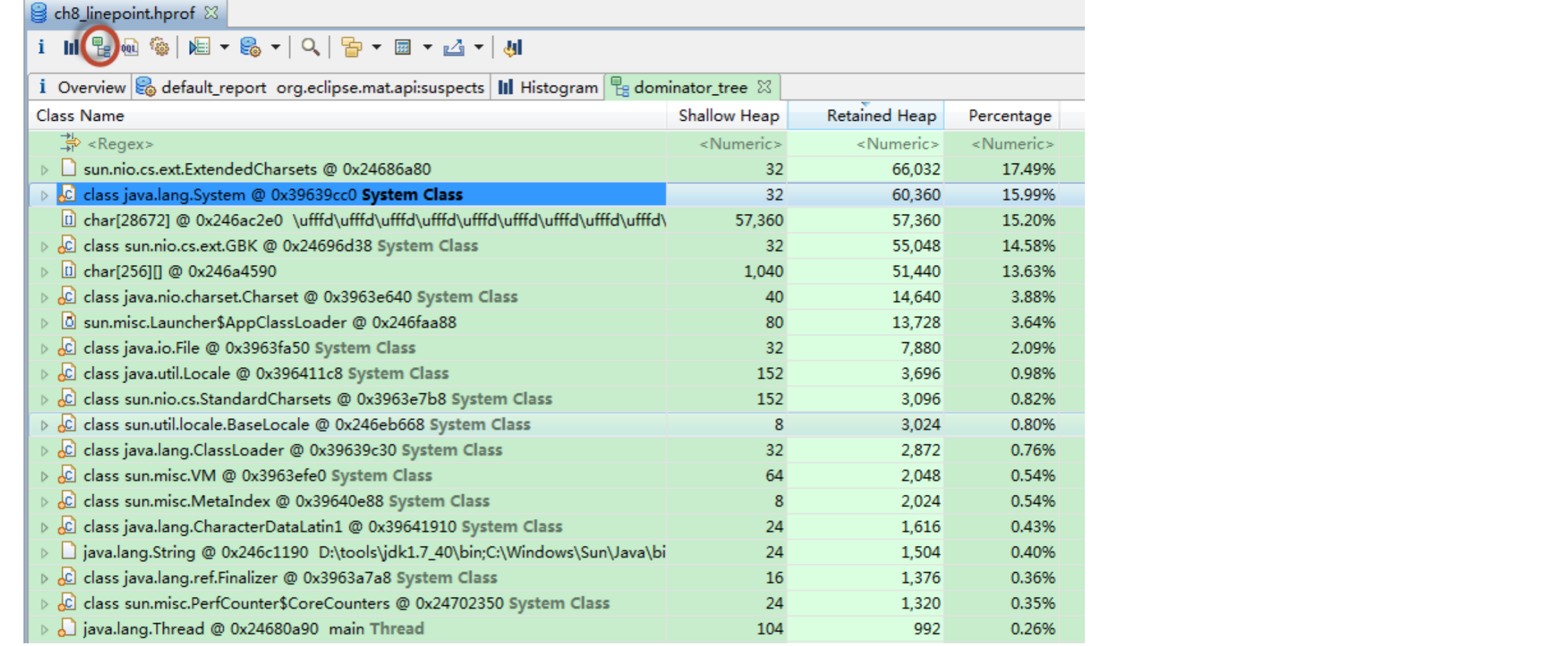 上图可以看到,左边是对象引用图(a引用c,b引用c,等等略),右边是支配树(图中有支配树的解释),我认为更确切的解释是“所有指向对象B的路径都 ** 必须并且只能 **经过A,则认为对象A支配对象B”,这里可以看到c可以通过a过来可以通过b过来,所以a、b与c之间没有支配关系,同样,可以退出上面的支配关系,但是注意h不能被f和g支配但是被c支配着,所以看似c和h之间离得很远,其实是直接支配的关系。