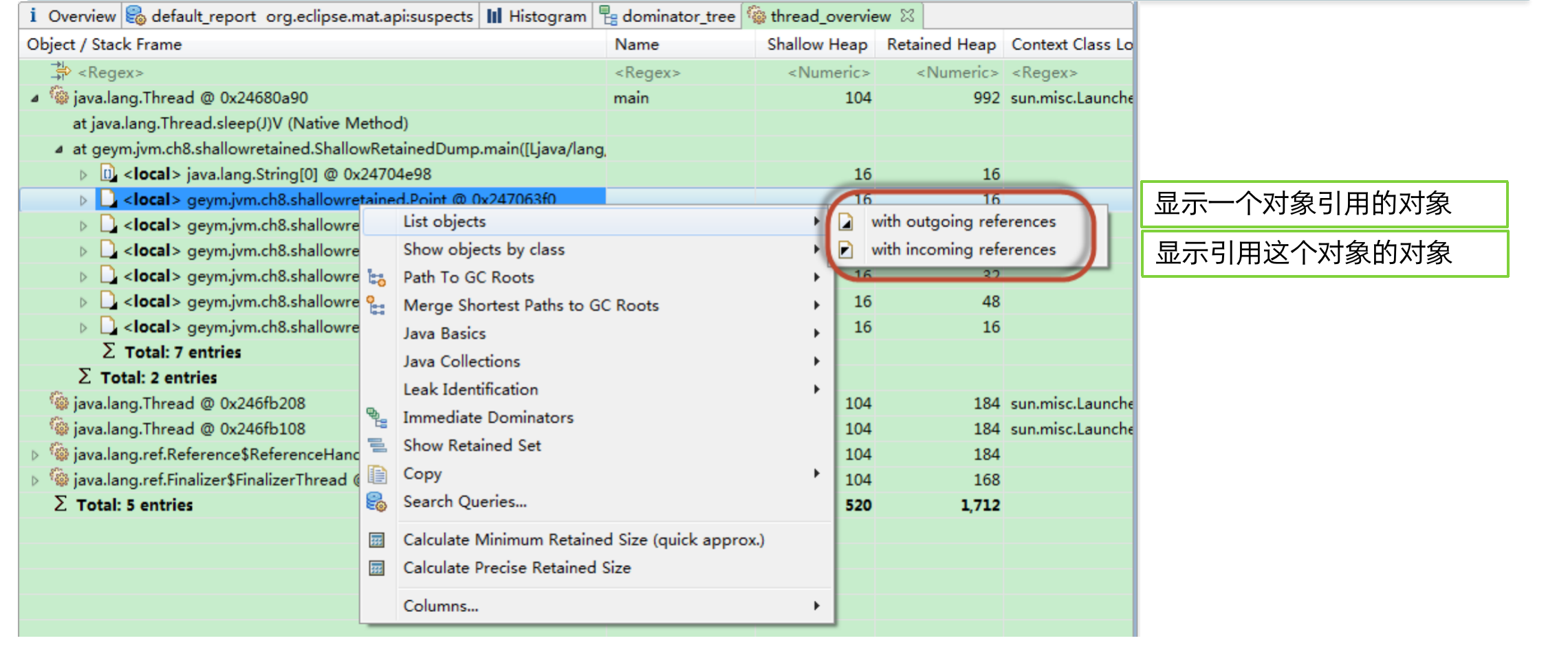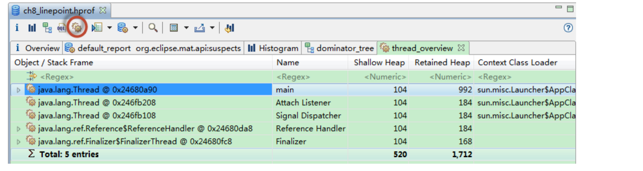 这里不是指线程堆栈的信息,而是每个线程在堆中的对象,比如这里就能看到主线程的一些信息,从而看到主线程的一些引用。