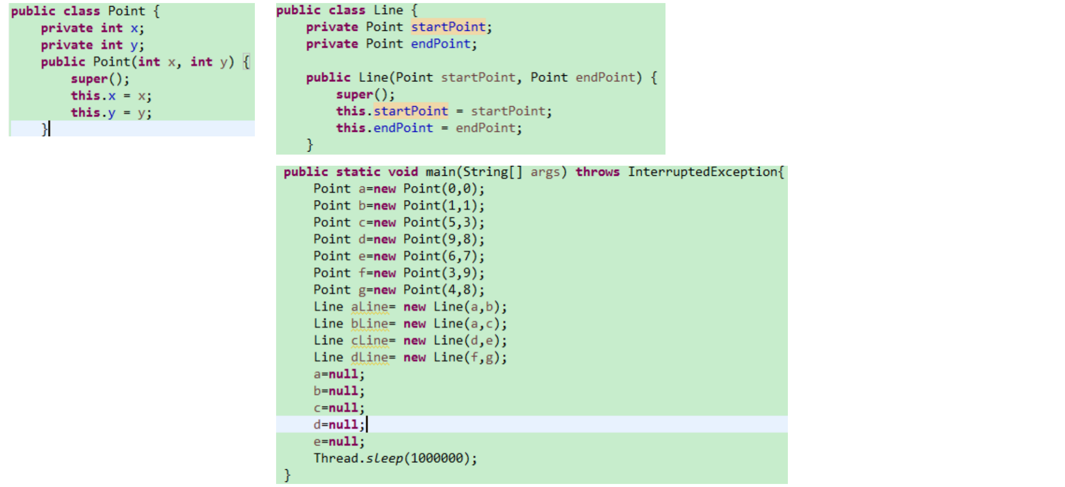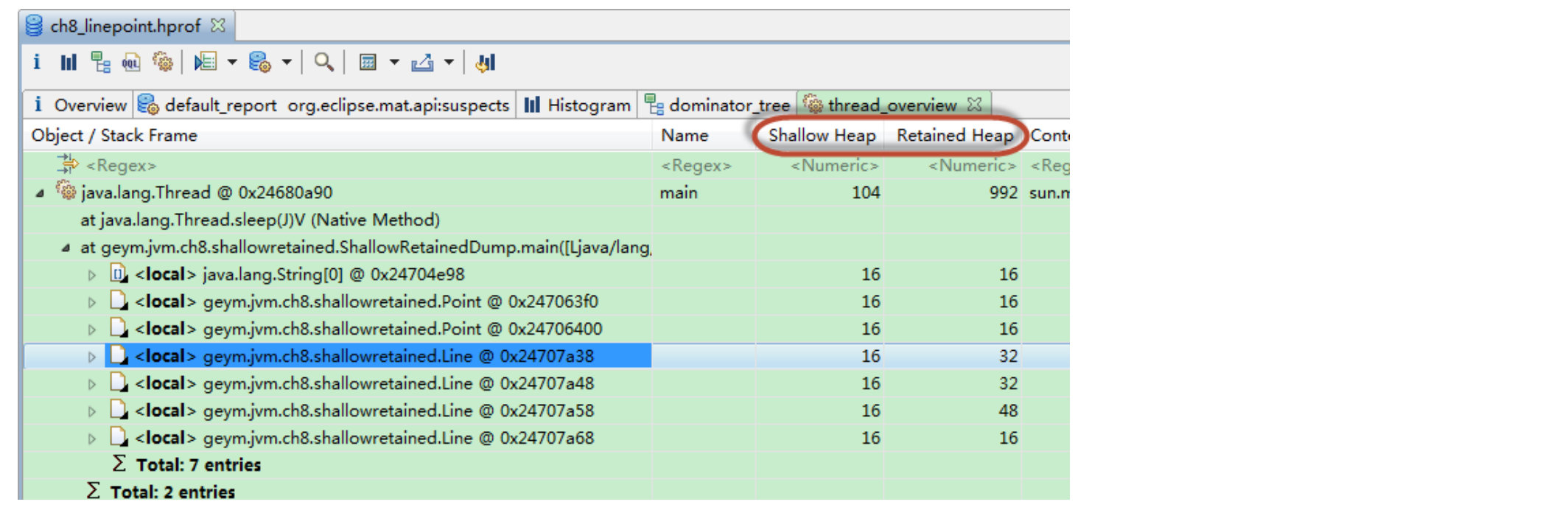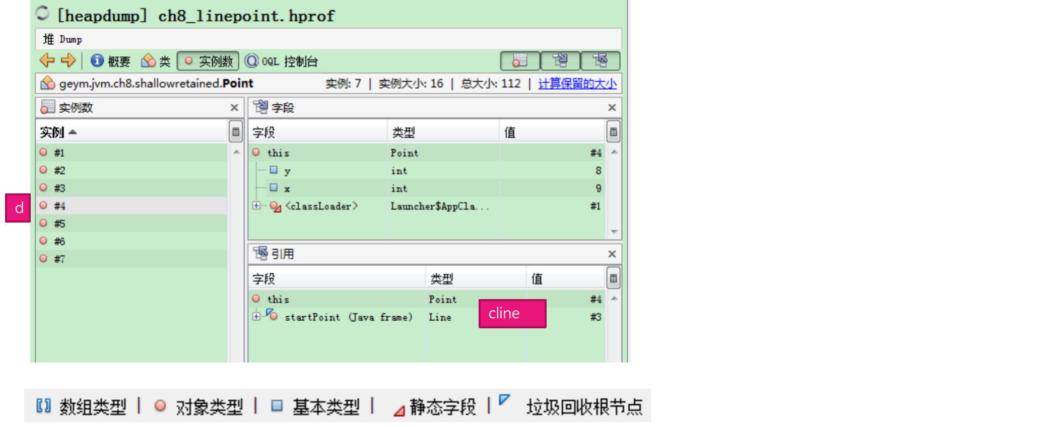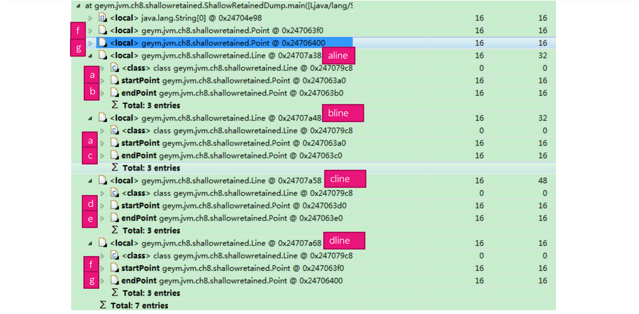 右边的第一列是浅堆,第二列是深堆,每一个浅堆(point和line,因为line中是两个引用, 引用是四个字节 )都是16,f和g是没有引用任何人,所以也是16,