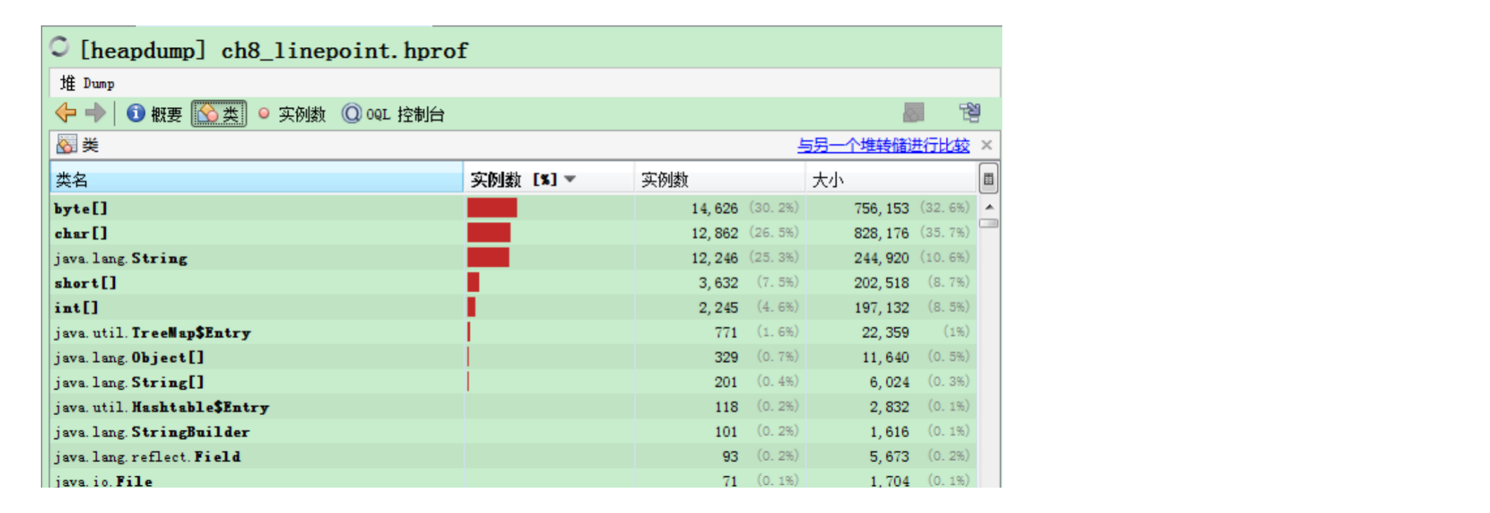 通过使用Visual VM可以知道哪个类的实例数是最多的,占用的空间大小是最多的,方便定位。