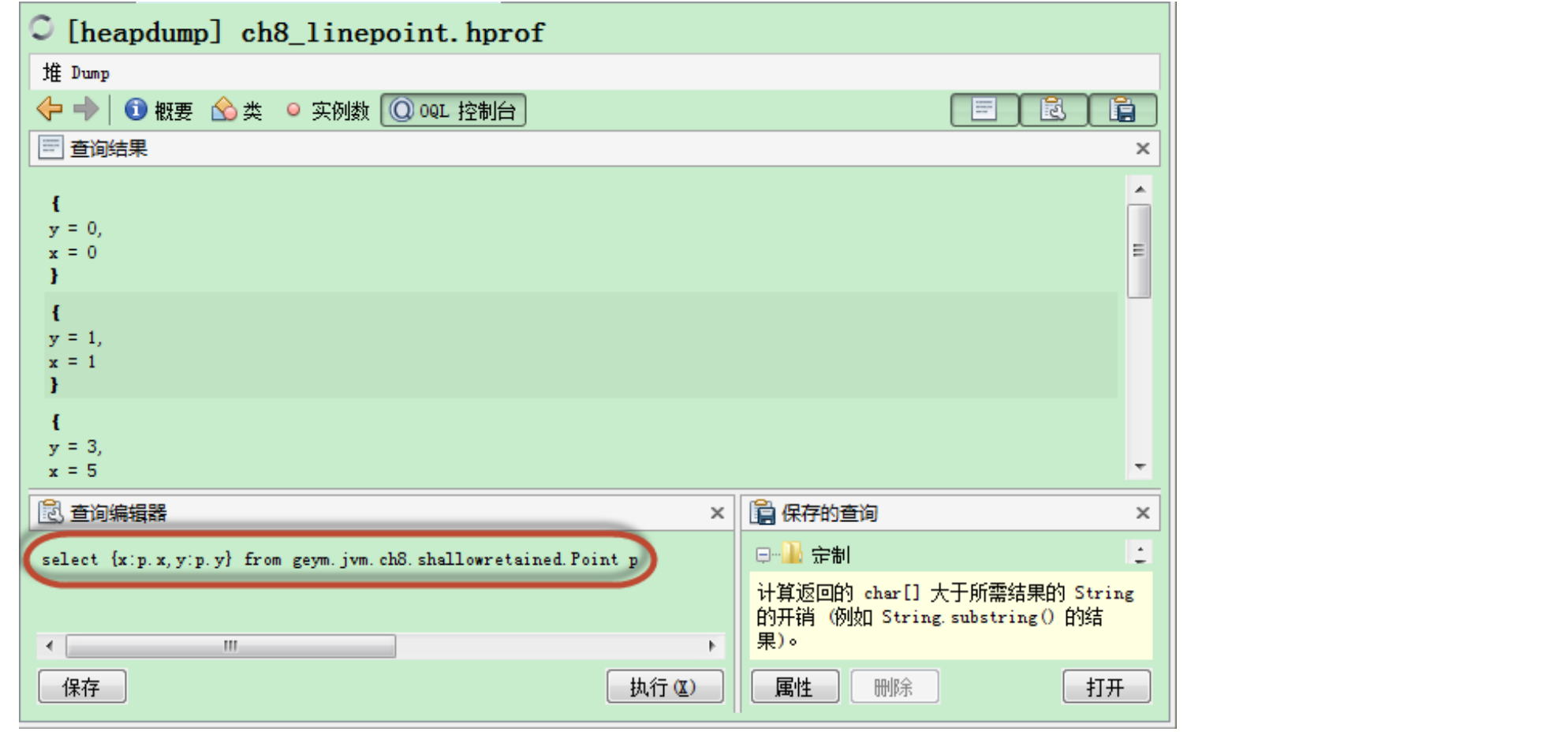 上图为使用OQL语句进行分析,通过类似于SQL语句的方式,进行查询,比如上面的OQL语句的含义就是将所有的point 对象通过{x:p.x,y:p.y}的json形式显示出来。