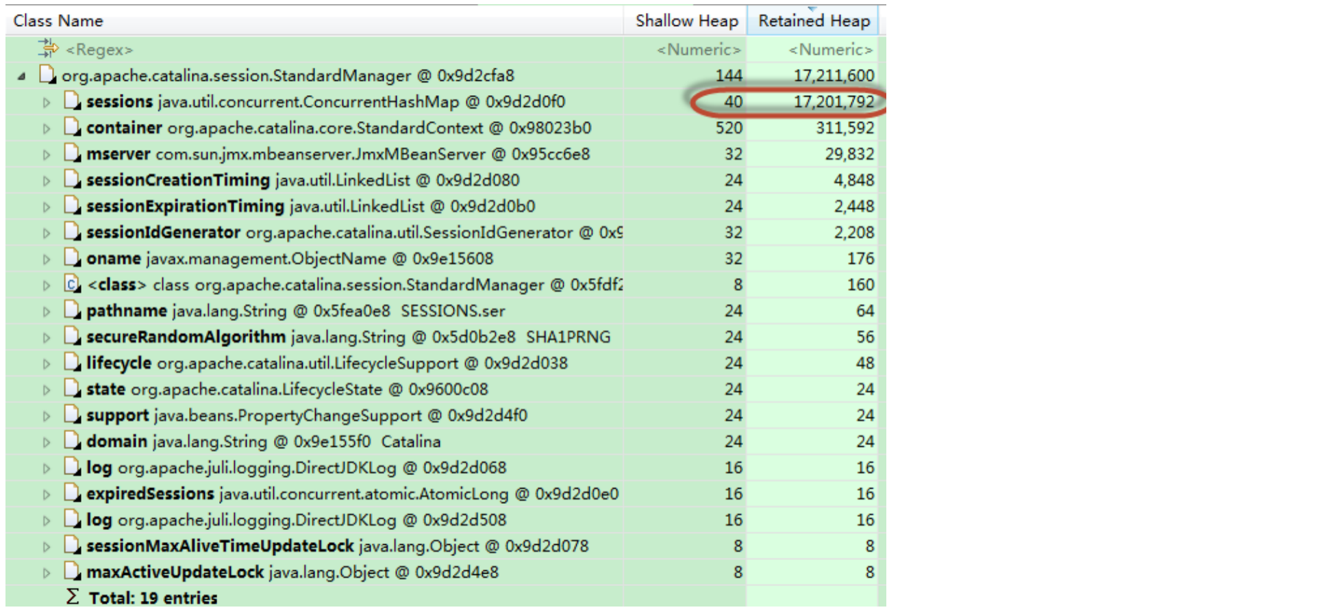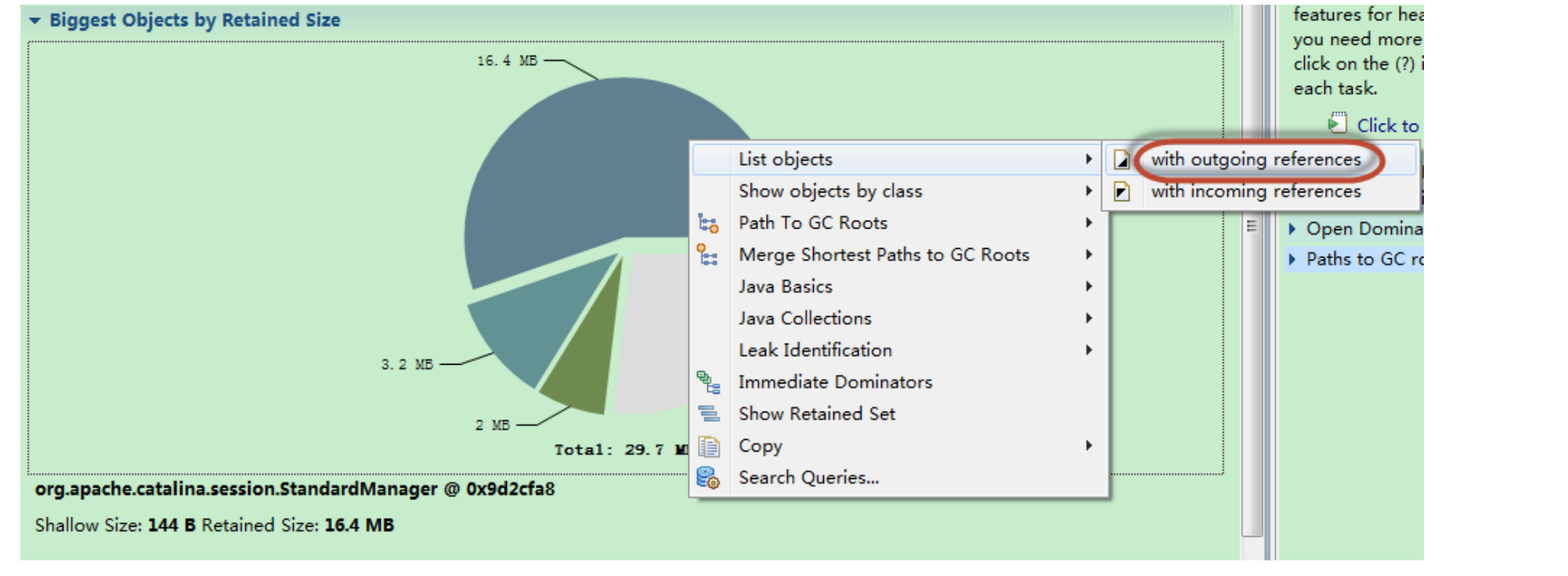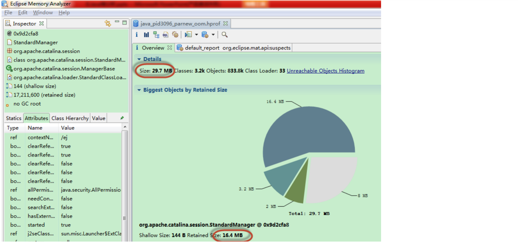 堆的大小是29m,推断当时,使用可30m左右堆的大小,所以29m的时候就发生了OOM的问题,还看到RetainedSize是16.4m,RetainedSize是释放掉对象后所能得到的空间,这个对象就是StandardManager,位于catalina.session包下,可以推断和session有关系,从图中可以看到最大的就是她16.4m