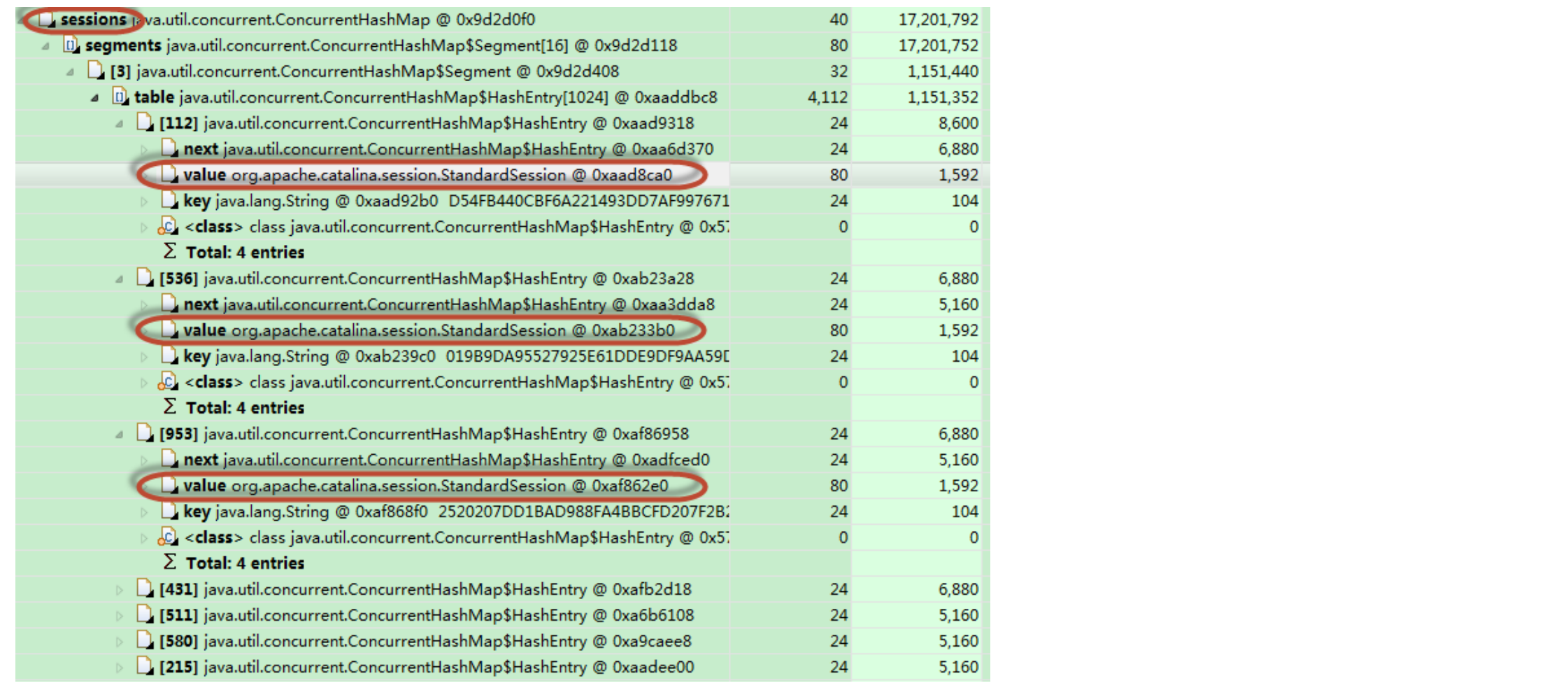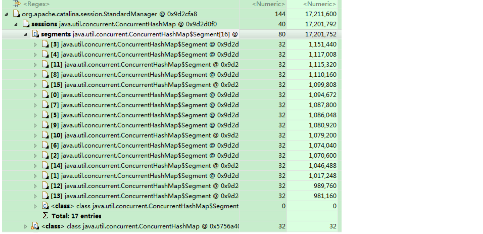 接着打开segement发现里面就是普通的table–》entry(表象)–》key、value,所以推断就是在保存了过多的session没有被释放