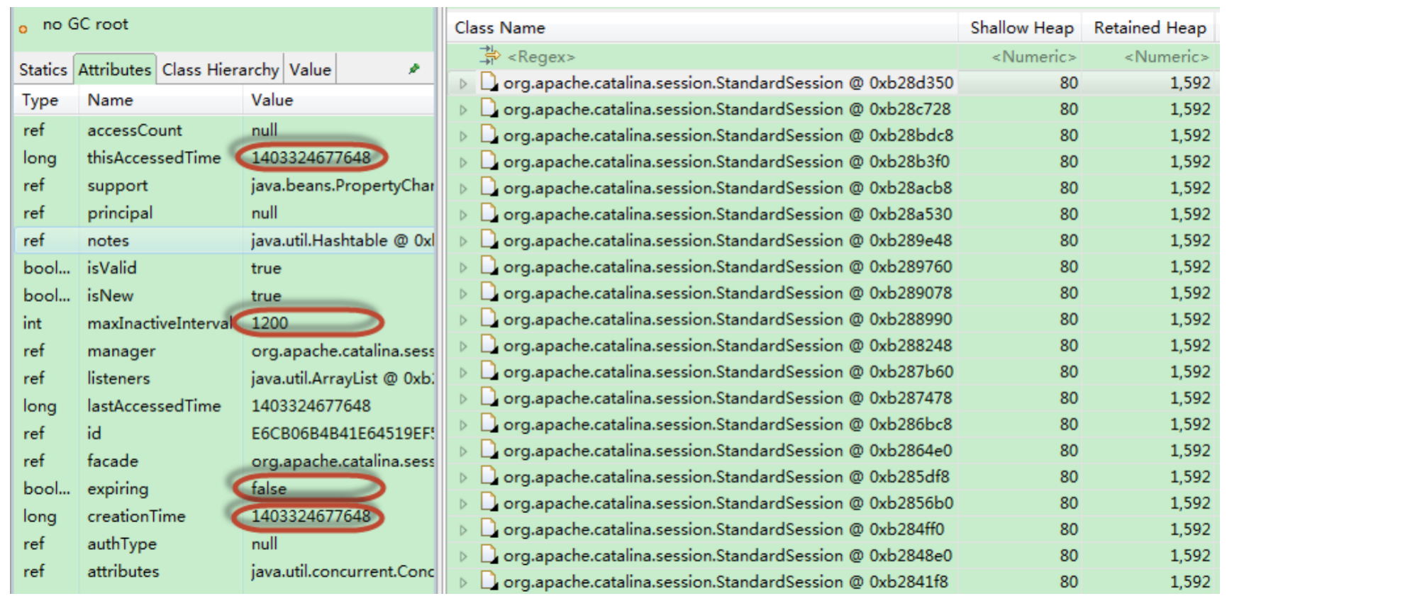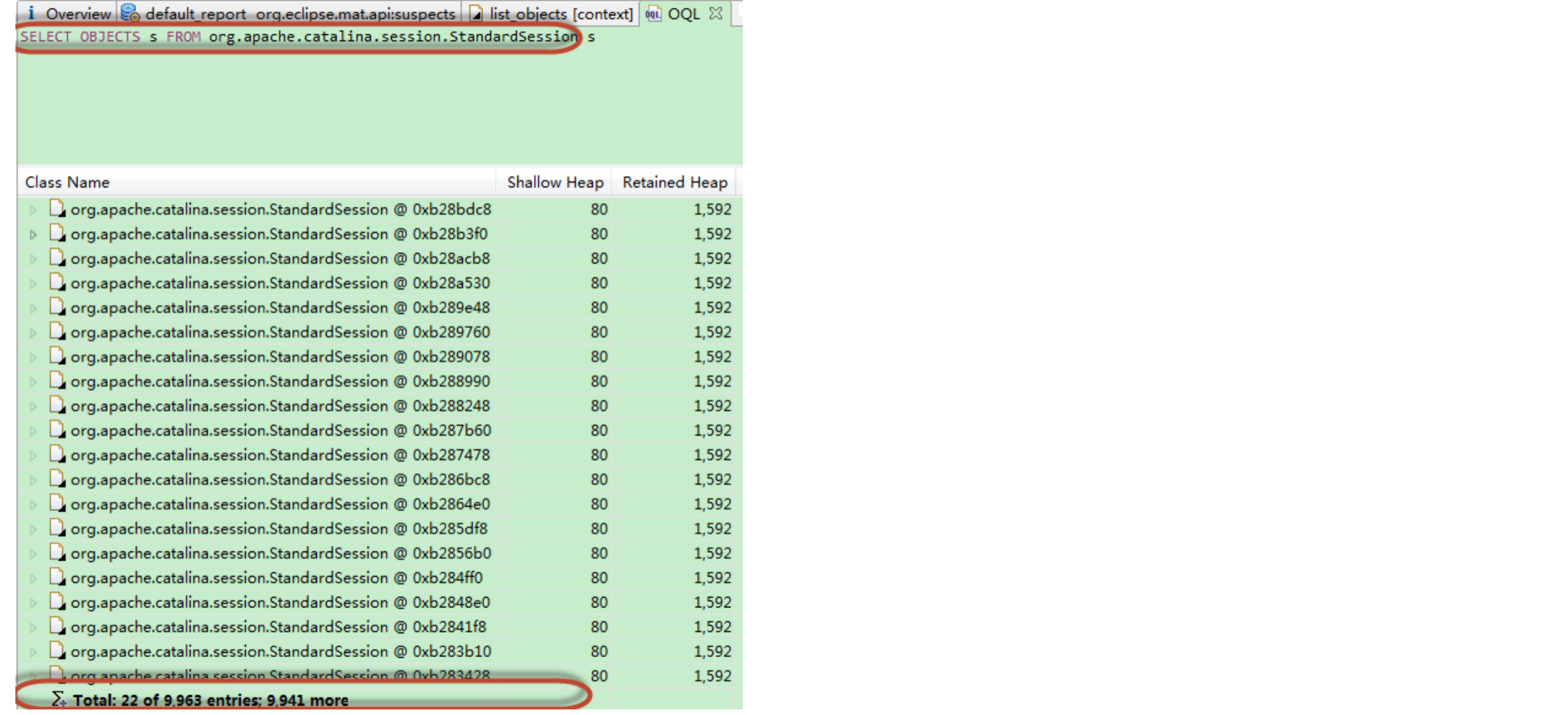通过上面的OQL将所有的standerdSession对象查找出来,查询的最后发现返回了9941个对象,每个对象的深堆将近1.6k。所以断定OOM的时候系统中存在大量的访问,所以持有大量的session没有被释放掉。