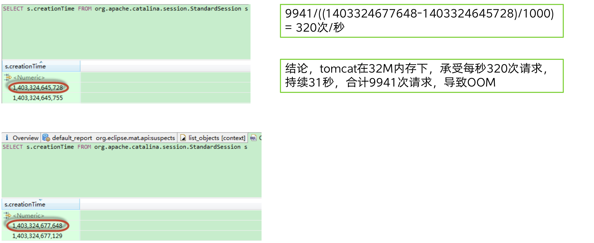 上图中最后一个session创建时间减去第一个session创建时间/1000就是一个再多少秒之内是有请求的,9941/这个数值,就是每秒有创建了多少个,即多少次请求,所以得出了上图的结论。