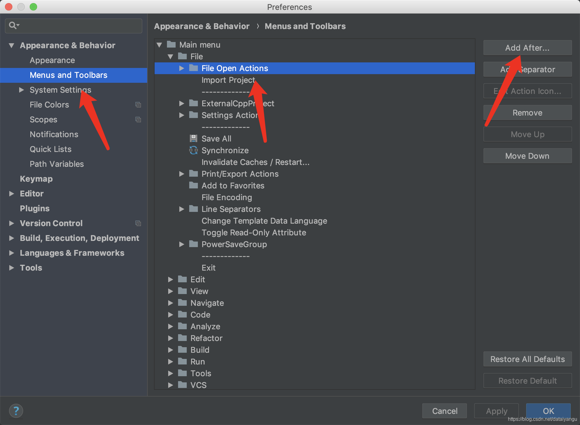 commad + ,进入设置页面,搜索框输入menu,选择file下面的任意一个都行: