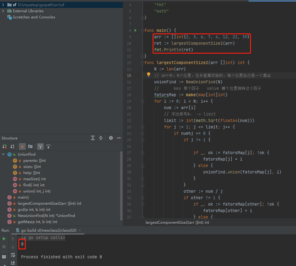 arr := []int{2, 3, 6, 7, 4, 12, 21, 39}