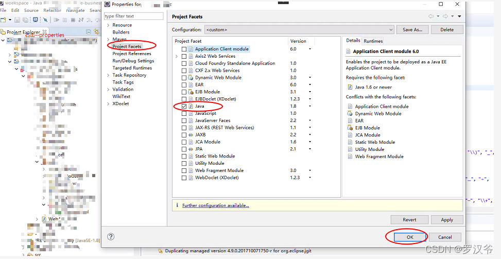 右击项目–》properties–》Project Facets–》勾选右侧的Java,然后保存。