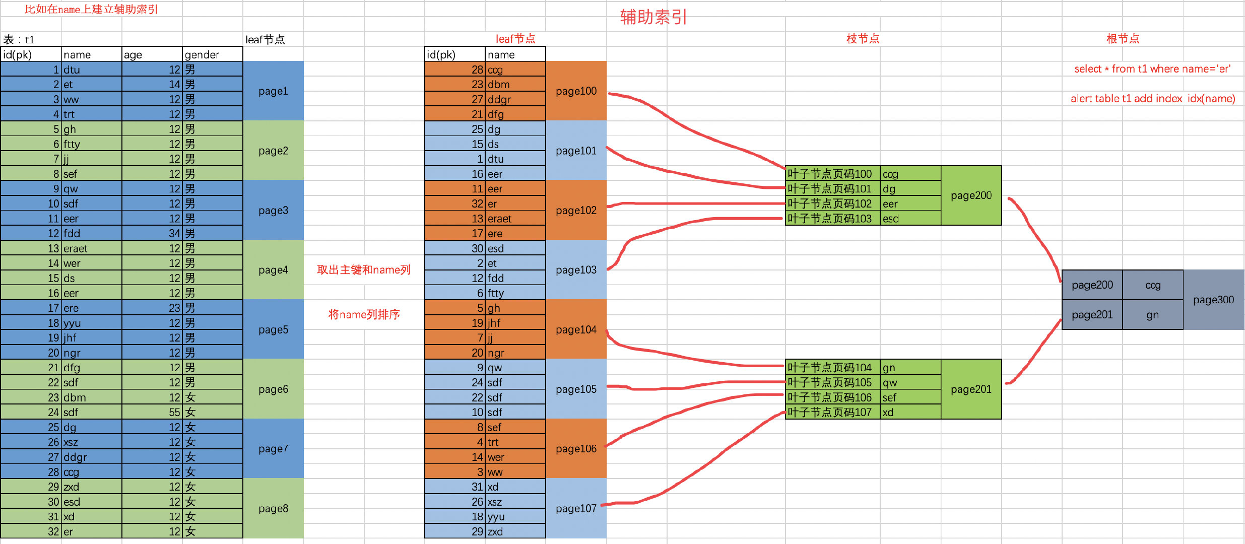 # 查询时,拿着name=er去一层一层找到er这个值,对的id,因为查的是*,所有,通过id再去原来的聚簇索引中找具体数据(回表过程)
