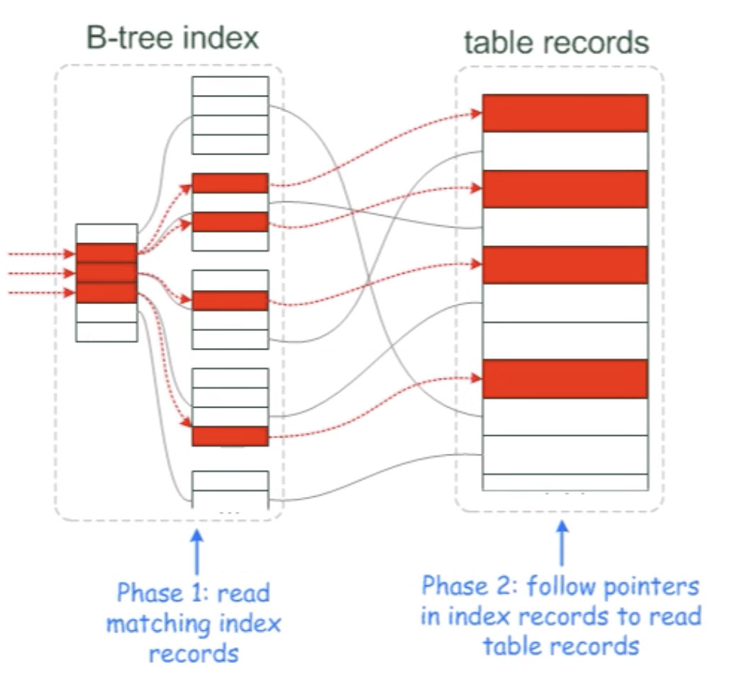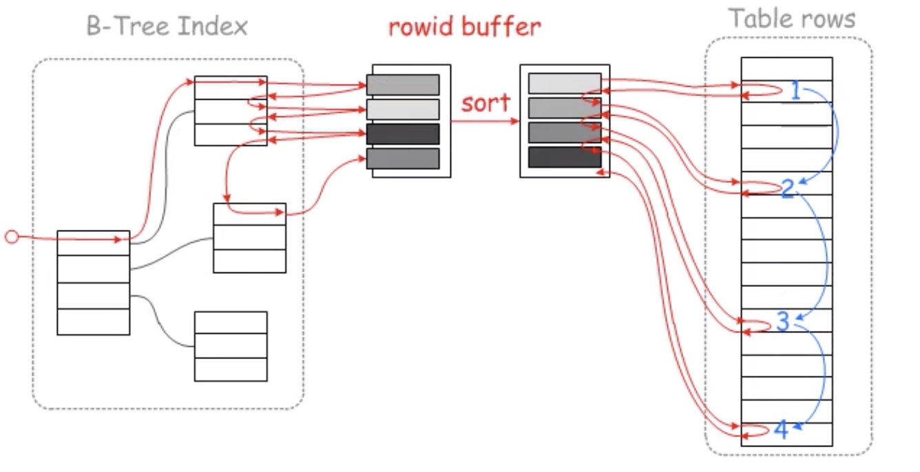在回表之前,先把id预存一下(缓冲区),排一下序(sort id),最后一次性回表(这样有顺序的就可以通过B+树的neighbour直接顺序取)