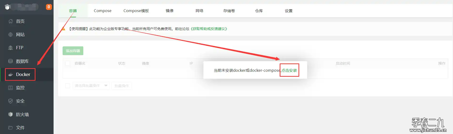 安装最新版宝塔面板,左侧docker进去安装,等着完成就好