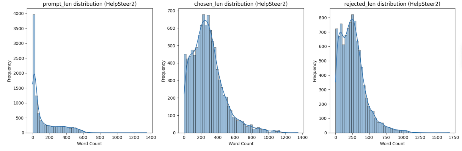 StackExchange 的chosen和rejected偏度、峰度均更高,说明其文本长度分布更 “极端”(少数超长文本影响大);而 HelpSteer2 分布更平缓,长文本的比例更均衡。