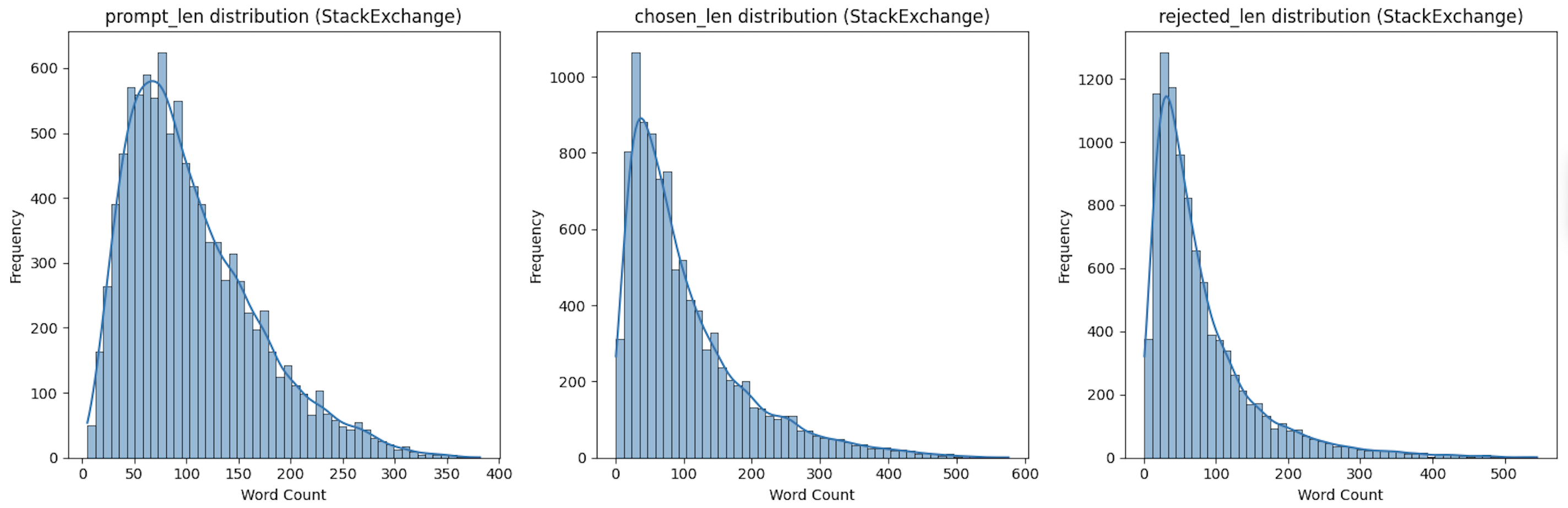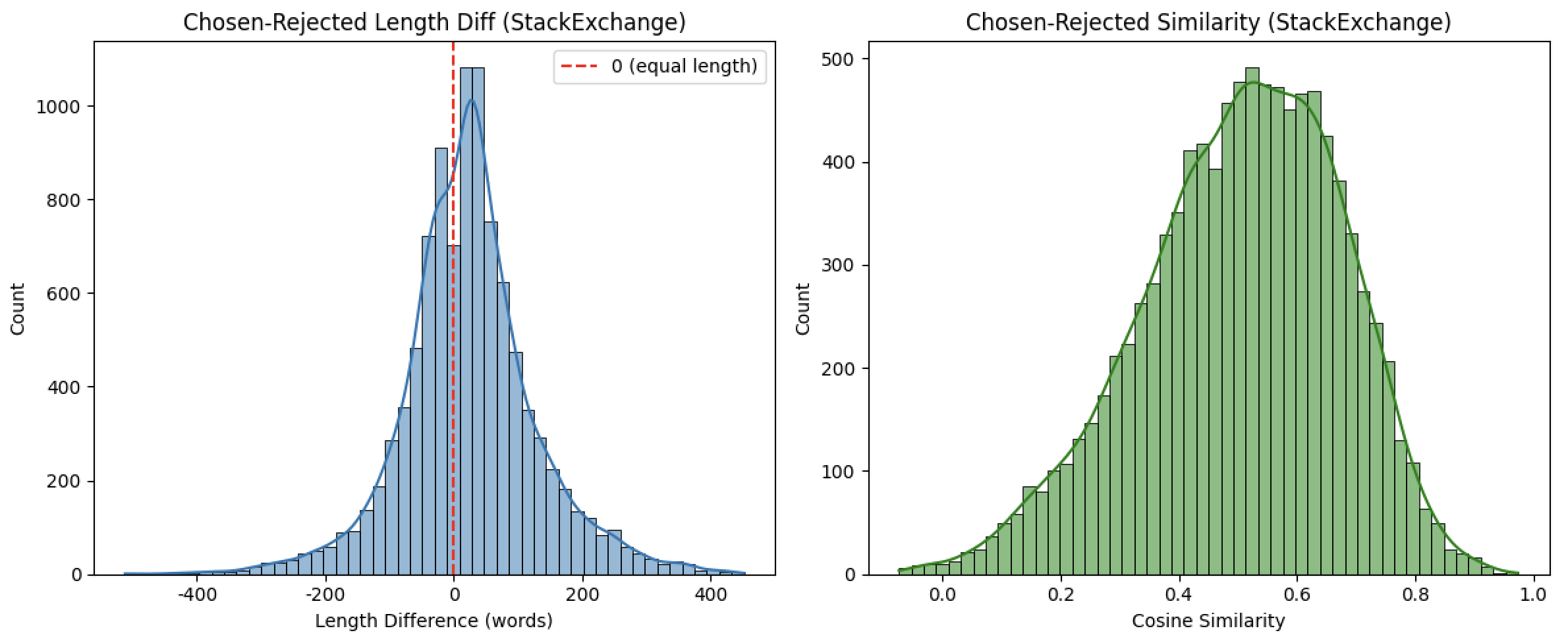 chosen(284.6 词)比rejected(260.5 词)仅长约 9%,说明 “长度” 不是其优质回复的核心特征(可能更依赖内容相关性、逻辑性)。 - StackExchange 中,