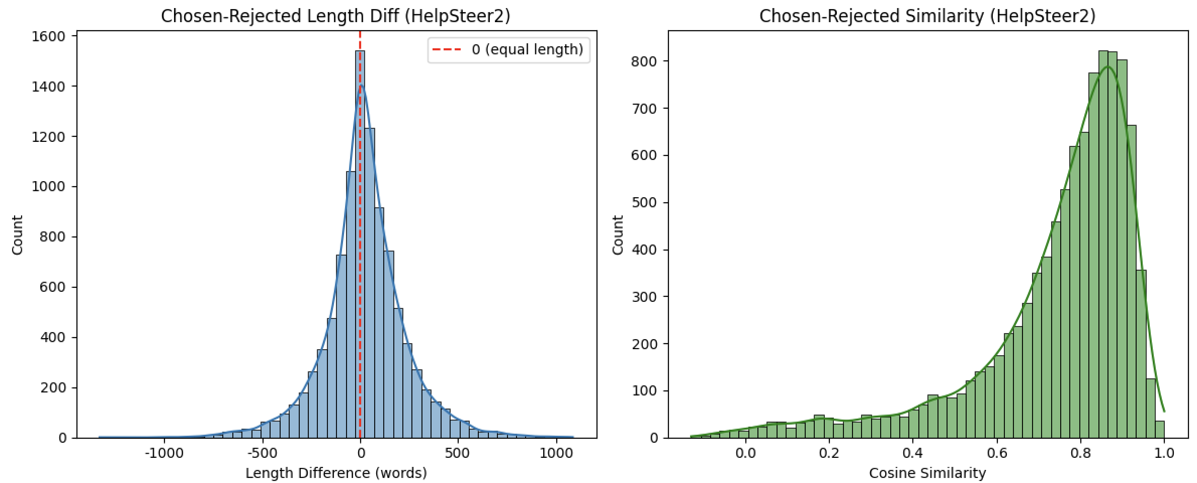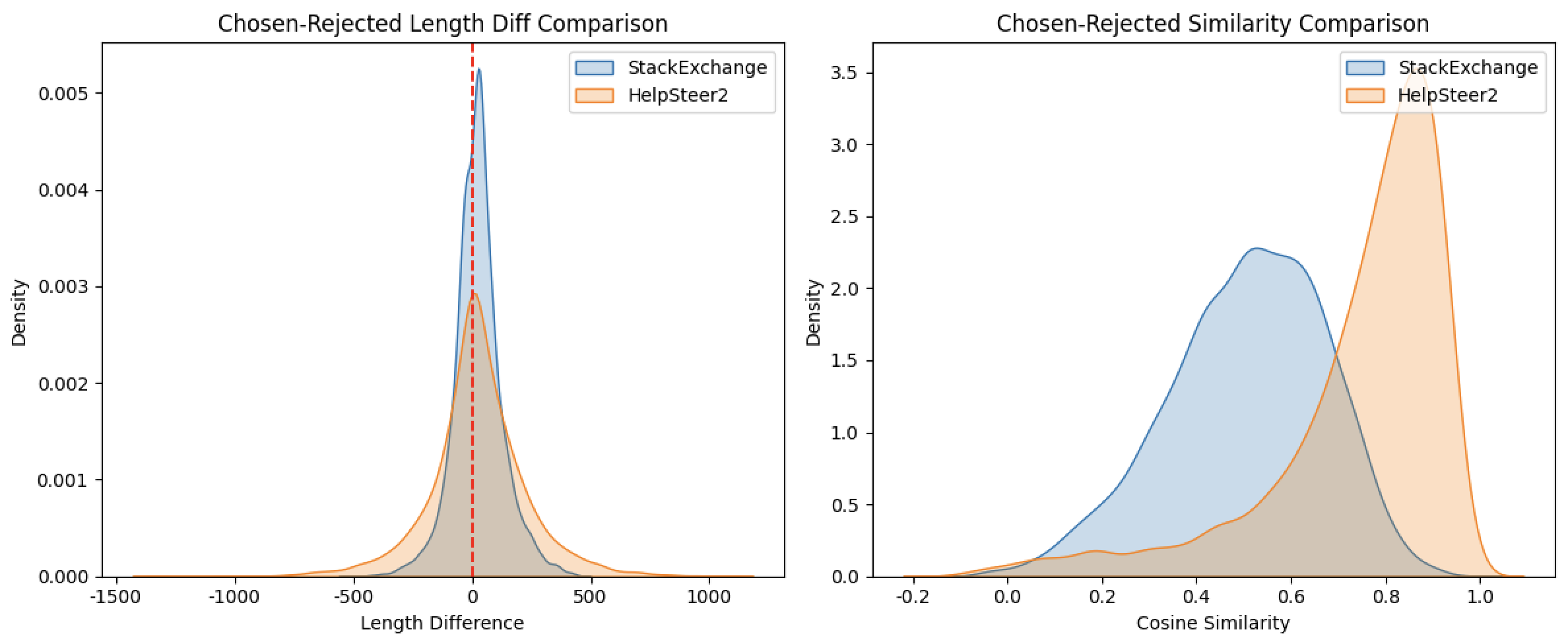 通过对比 StackExchange 和 HelpSteer2 两个数据集的长度差(chosen - rejected) 和语义相似度指标,可清晰发现两者在 “优质回复与劣质回复的差异特征” 上存在显著不同,具体分析如下:
