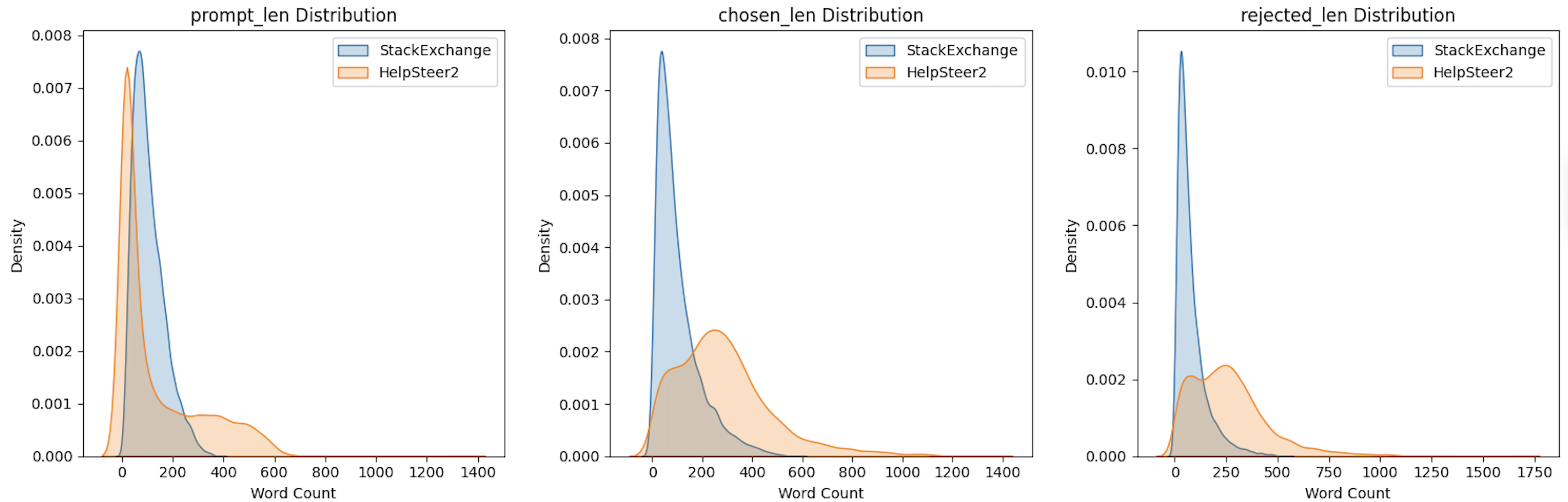 | 平均长度 | 260.5 词 | 79.3 词 | HelpSteer2 的劣质回复平均长度是 StackExchange 的 3.3 倍,差距比优质回复更显著。 |