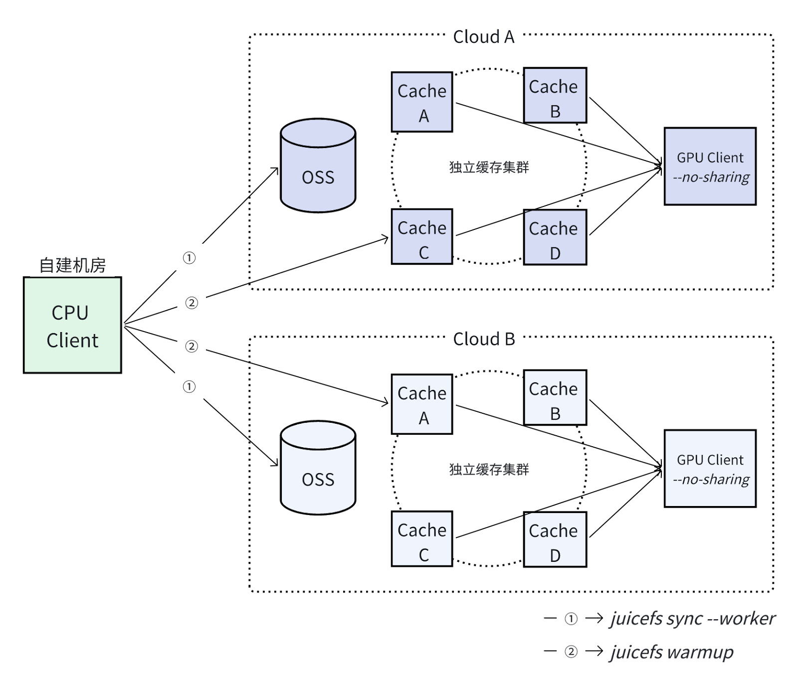 需要注意的是,部分云厂商的 GPU 节点不配备本地 NVMe 硬盘,即使有盘的 GPU 节点受资源波动或者硬件故障的影响,运行中可能频繁上下线,不适合承担缓存任务。为确保缓存的持久性与稳定性,我们将缓存服务部署在少量稳定的非 GPU 通用计算节点上,并借助 JuiceFS 的灵活挂载机制实现与计算节点解耦的独立管理。该方案已在多个云平台上稳定运行,成为支撑多云推理架构的关键存储基础之一。
